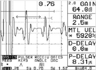在脈沖零點(diǎn)交叉模式下A掃描顯示在1次和2次底波之間的厚度測量,實(shí)際的厚度測量值0.76"顯示在A掃描儀器上(中空渦輪葉片的厚度測量用儀器CL5和探頭K-Pen)。