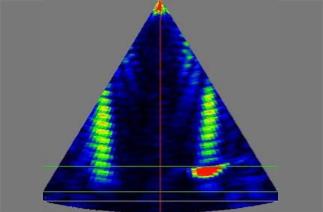 探針在螺栓上旋轉360°以致扇形掃描完全覆蓋螺紋。 左側圖顯示采用扇形掃查可以探測單個螺紋, 帶有缺陷區域的反射信號會顯著增加(紅色區域)