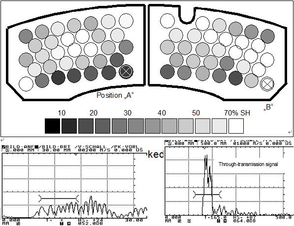 In the case of cracks and bonding defects, a low through-transmission amplitude is obtained due to the reduced acoustic transmittance. On the other hand, a high sound amplitude indicates a flaw-free area.